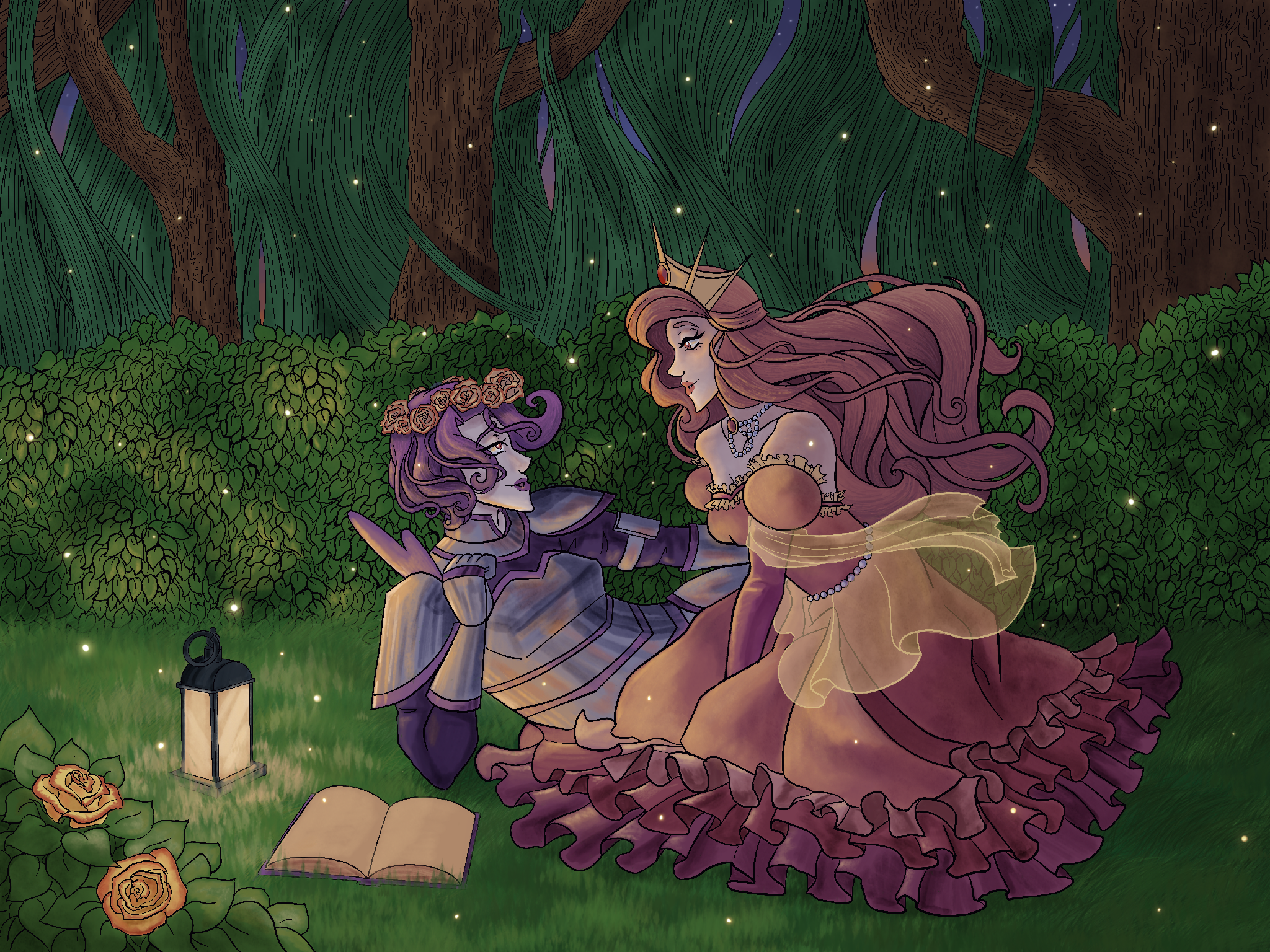 Artist Statment: Sunset Violet is the fairytale lesbian romance that I needed as a child. Growing up I never saw positive queer representation until I got to high school, well after the point I started to realize that I was a woman attracted to other women. My story and illustrations feature two lesbian leads, The Sunset Princess and Violet Knight who come together by a chance of fate. In short, the story revolves around the princess as her father falls mysteriously ill. A tournament is held to find the princess a suitor in the event that the king passes and she must rise to the throne. During this tournament, the Sunset Princess meets the Violet knight who becomes her personal guard. As the tournament trials go on, the Knight shows the princess that her life isn’t as set in stone as she believes and the only one who can rescue her from her fate is the princess herself.